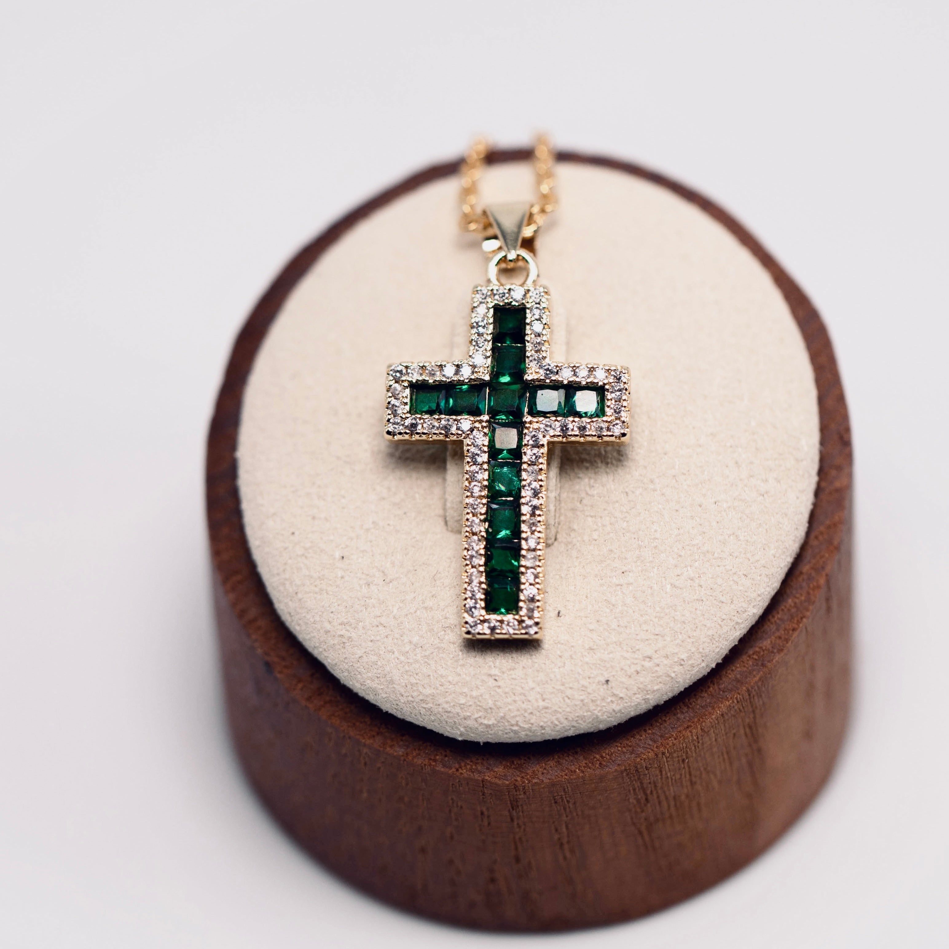 Featuring a finely crafted cross pendant adorned with vibrant emerald gems, this piece offers both a refined touch of colour and biblical symbolism.